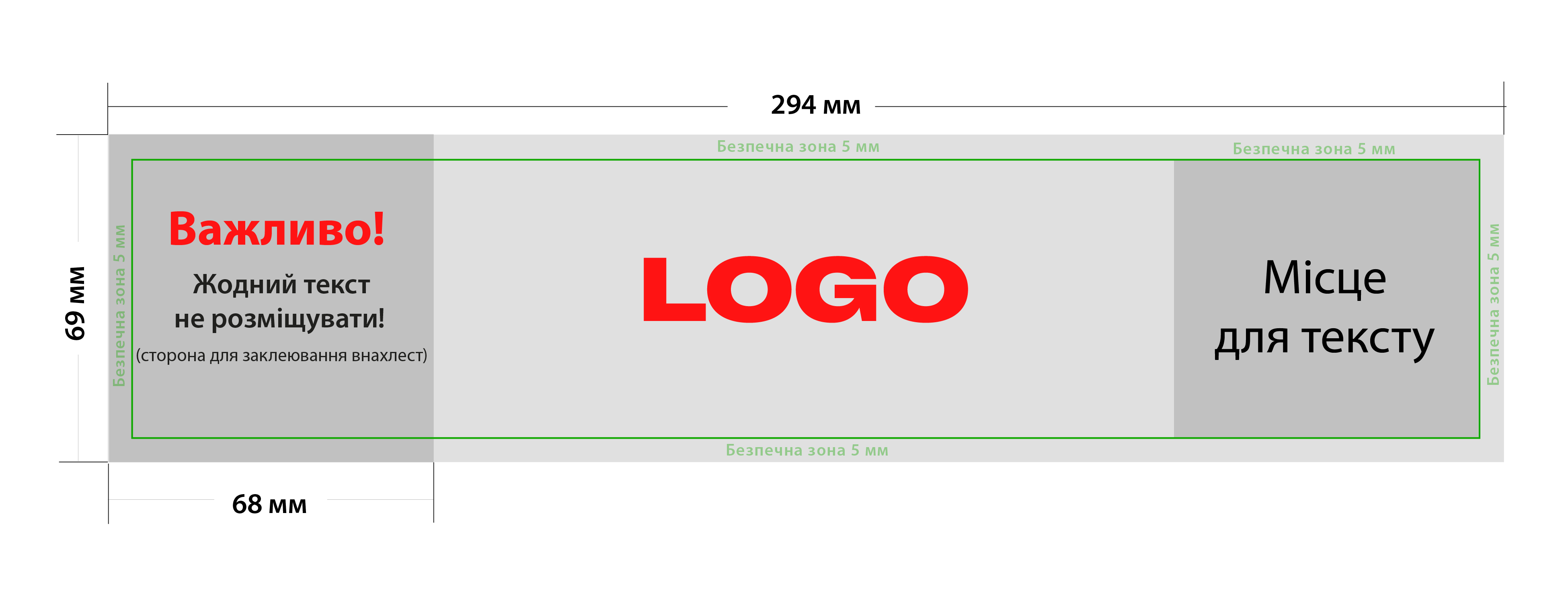 Необхідно подавати для друку 294*69 мм (вильоти під обріз по периметру не додавати). Важливі елементи в дизайні повинні розташовуватись не ближче 5 мм до країв оригінал-макета.