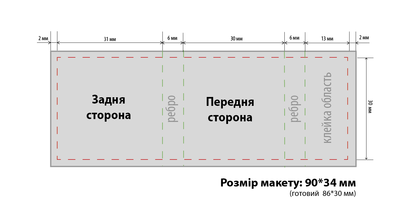 90×50 мм — подавати для друку 92×52 мм (по 1 мм з кожного боку під обріз). Важливі елементи публікації повинні розташовуватися не ближче 4 мм до краю обріза.